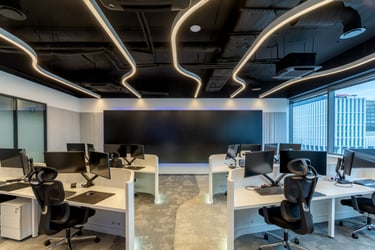 The most distinctive element is the suspended linear lighting fixtures; their futuristic shape, cutting across the entire office, sharply contrasts with the raw, black ceiling and exposed installations, giving the entire space a dynamic character.