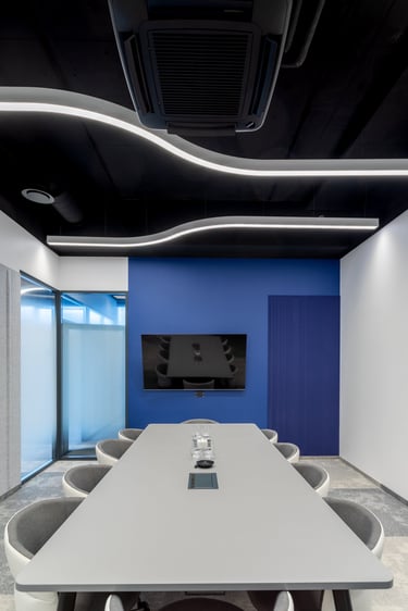 The interior is defined by strong color contrasts and dynamic lines, based on a palette of deep blue, white, and shades of gray. Blue accent walls featuring the company logo build the brand's identity within the space.
